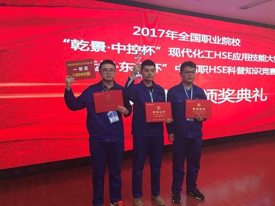 11月29日至12月1日,由中国化工教育协会、全国石油和化工职业教育教学指导委员会、中国职业安全健康协会职业安全健康教育专业委员会主办的“乾景-中控杯”现代化工HSE应用技能大赛、“远恒-东方杯”中高职HSE科普知识竞赛在徐州工业技术学院举行。大赛共吸引16个省市自治区、42个院校、92支代表队伍参赛,经过三天的激烈争夺,我校应化学院学子获得“乾景-中控杯”现代化工HSE应用技能大赛一等奖、“远恒-东方杯”2017年全国职业院校中高职HSE科普知识竞赛两个二等奖的好成绩,王静、鲁凤、康小珍获得优秀指导教师称号。