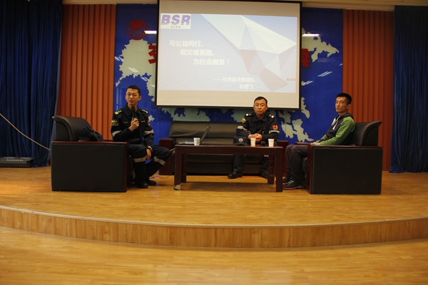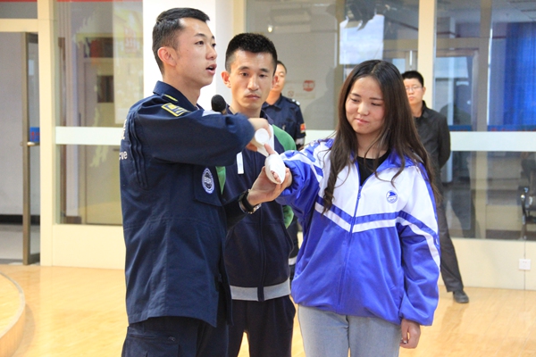 於若飞结合自己的亲身经历,用精美的PPT,幽默风趣的语言,清晰的给同学们讲解了关于地震、火灾、水灾、踩踏事件等的自救知识,他干练、稳重的形象给在座的学生留下深刻印象。於若飞还和现场同学互动,给学生进行了现场教学,并介绍了一些生活中小物品的自救功能,让在场所有人都受益匪浅。同学们都把这次沙龙看成是一次学习急救知识的好机会,积极的参与互动,配合进行现场演示和实际操作。於若飞就同学们心中的疑惑,进行详尽细致的讲解。