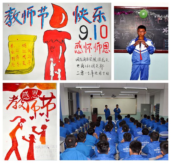为庆祝第三十三个教师节,营造尊师重教的校园良好氛围,校团委在教师节来临之际,组织各个团支部开展了教师节主题团日活动。各班的班委积极响应,带领班级同学们行动起来,举办“感怀师恩”教师节主题活动,共同为老师们送上诚挚祝福。9月10日,我校在东西区同时组织开展了主题为“感怀师恩”的主题团日活动。在这个秋意浓浓的日子里,各院(系)组织学生为各位教师送上祝福贺卡,并送上了真挚的问候“老师,您辛苦了!祝您节日快乐”。有人说:老师是人类灵魂的工程师:老师是蜡烛;老师是园丁......这都是人们对老师高度的评价,你们的一个微笑、一个眼神,足已让我们欣慰万分。同学们通过海报、板报的方式,为老师们送上节日的祝福,海报、板报内容不同、风格各异,同学们纷纷用自己的画笔为一年一度的教师节增添了丰富的色彩,表达着对老师的感激之情。