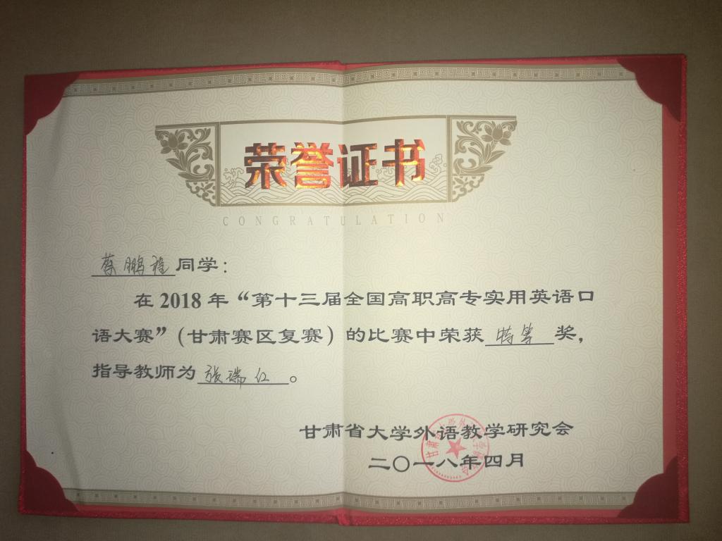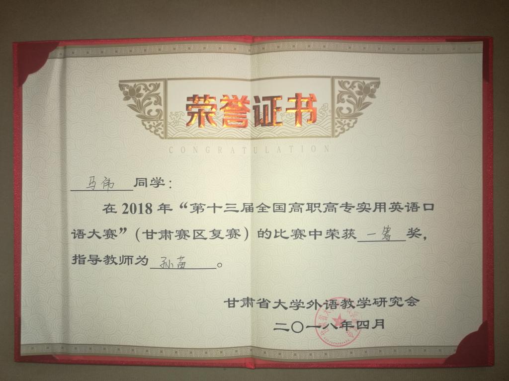 2018年4月1日,第十三届全国高职高专实用英语口语大赛(甘肃赛区复赛)中暨全国职业技能大赛英语口语选拔赛在甘肃有色冶金职业技术学院举办。经过为期一天的激烈角逐,各大奖项各归其主。