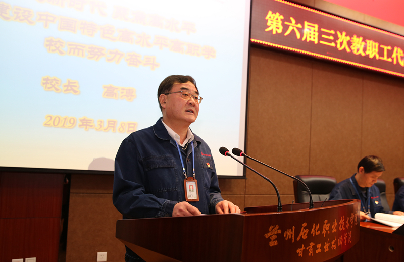高溥强调,2019是学校建设优质高职院校的验收之年,是“双高”院校建设和本科层次申报之年,也是狠抓落实之年,认真做好今年各项工作,具有十分重要的意义。现在,任务已经明确,关键在于落实。面对新时代经济社会发展的新形式,学校领导班子将团结带领全体师生员工,深入学习贯彻习近平新时代中国特色社会主义思想和党的十九大精神,主动服务国家战略和石油化工行业、甘肃省经济社会发展需要,按照学校“十三五”规划的目标任务,抓住机遇,直面挑战,深化改革,提升质量,继续推进“奋进之笔”,努力交出新时代发展“得意之作”,把学校建成一流优质高职院校,力争成为“双高”院校建设单位,为经济社会的发展和高等职业教育事业的发展作出新的更大贡献。