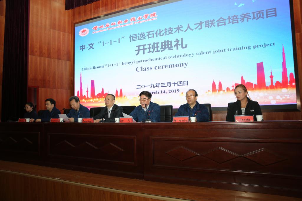 3月14日下午在我校西区多功能报告厅召开“中国-文莱‘1+1+1’恒逸石化技术人才联合培养项目”首批学员开班典礼。参加此次开班典礼仪式的领导有甘肃省教育厅国际合作交流处处长张宏,学校党委副书记校长高溥、学校党委副书记黄义仿、学校纪委书记蒲卫晖、学校副校长魏海明、恒逸(文莱)企业代表罗晓慧和Farida(华丽达)女士、相关二级学院和职能部门负责人、任课老师代表、来自文莱的31名学生及在校学生代表。开班典礼由黄义仿主持。