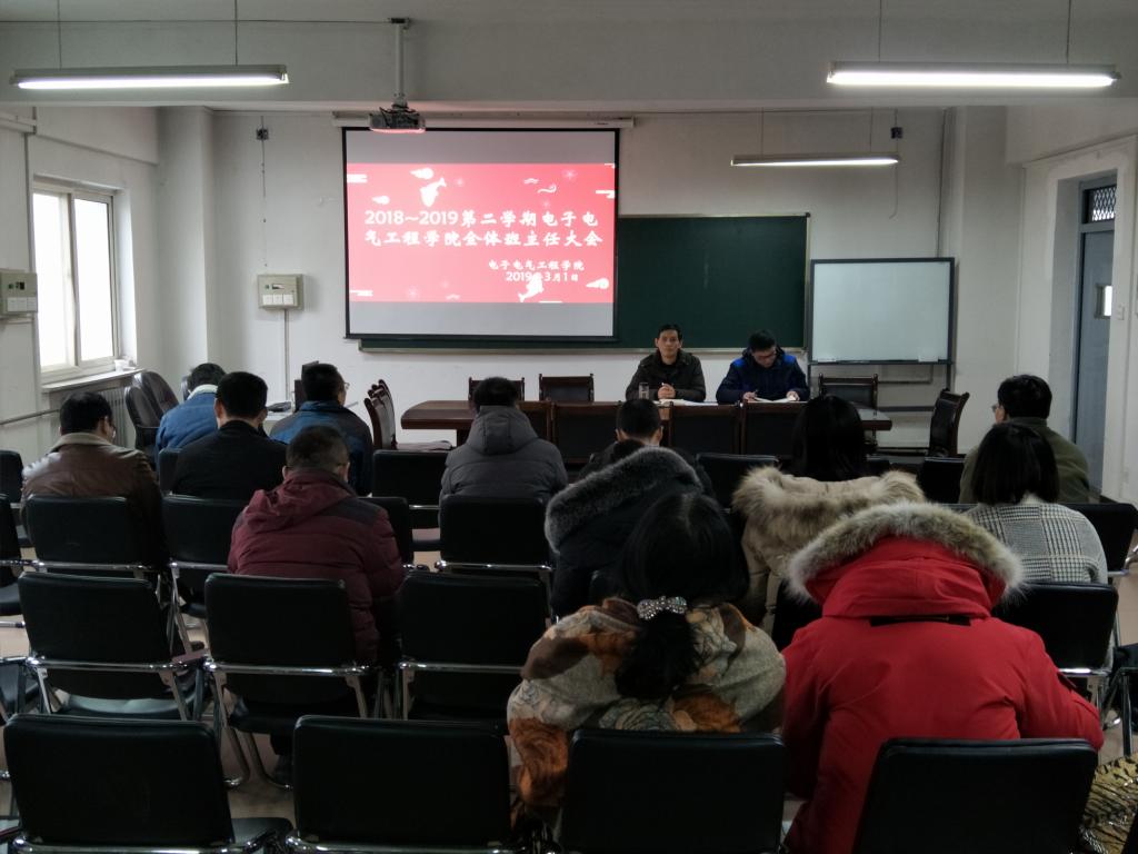 3月1日,电子电气工程学院在院办会议室召开全体班主任大会,党总支书记张军、办公室副主任陈鹏以及全体班主任参加了此次会议,会议由陈鹏主持。