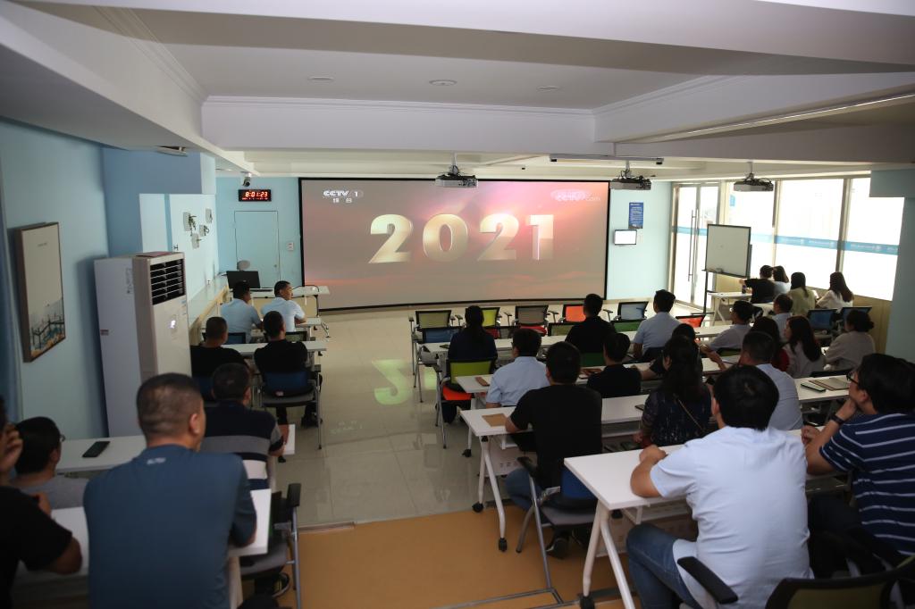 直播近2个小时.各场地聚满了满心期待的师生们。8时整,庆祝大会正式开始。在激昂的国歌声中,全体师生起立,大家的眼睛都紧紧盯着屏幕,共同见证这一盛事,认真聆听习近平总书记的重要讲话。